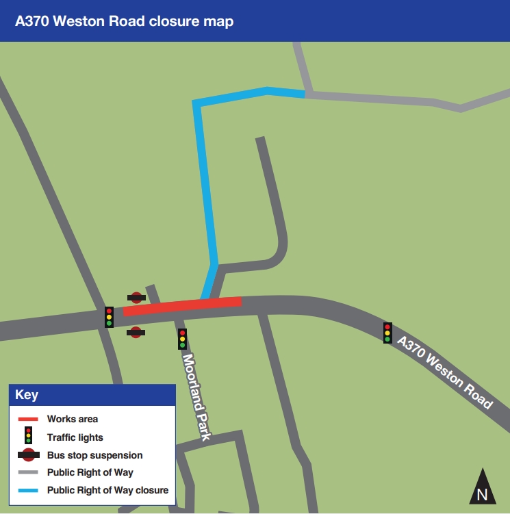 Weston Road (A370) | 7 November to 4 December 2025 | Reinstatement works involving the removal of a temporary access point on the A370 Weston Road to restore the area to its original condition. Please note, all timings are subject to change encourage you to check the information on this page regularly for updates. | Three-way traffic signals will be in operation 24 hours a day from 7 November to 4 December 2025. Our contractors will be working onsite during the hours of 7:30am and 5:00pm each day. The traffic management is located in close proximity to Moorland Park bus stops, resulting in their suspension for the duration of these works. The adjacent pedestrian footpath will be closed from 3 November to 28 November, with Traffic Management Operatives present during working hours. Please note there will be no diversion in place for the footpath closure. | View map |