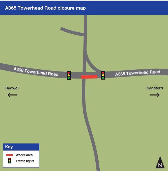 A368, Towerhead Road | Dates are expected to take place in December but are subject to change depending on weather conditions. Please check this page regularly for updates, as dates may be confirmed at short notice. | Reinstatement works involving the removal of a temporary access point. Works include reinstating the original road layout, kerbs and traffic signs. | Two-way traffic lights will be in operation 24 hours a day for the duration of works. Working hours will be 7:30am - 5:00pm. Our contractors, Balfour Beatty, will be working onsite during these hours. Outside these hours, the traffic lights will remain operational for safety reasons. | View map |