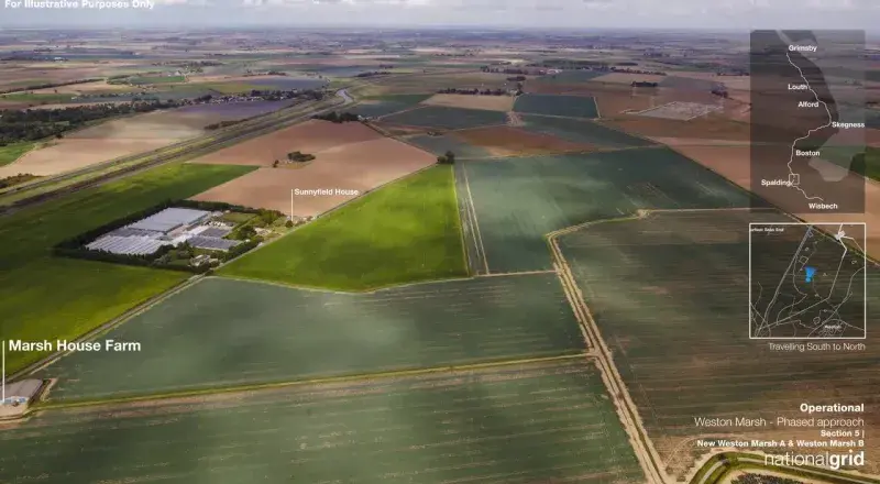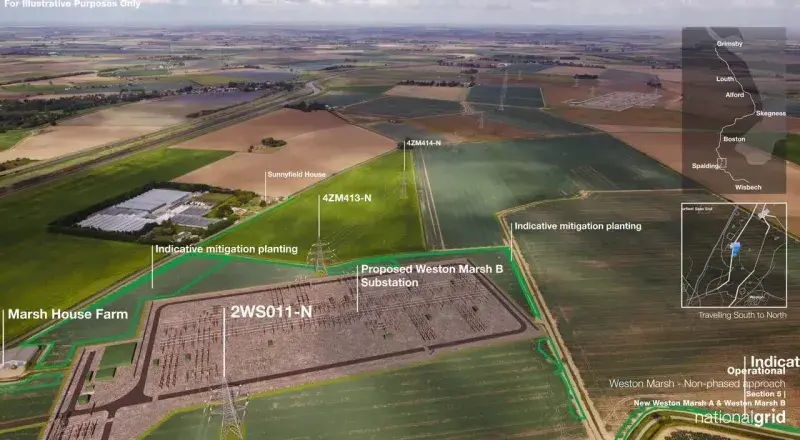 Weston Marsh Substation A site would cover around 10.6 hectares and be located north of Weston and just east of Marsh Road, near Surfleet Seas End. Weston Marsh Substation B site would cover around 8.4 hectares and be located north of Stone Gate and east of Marsh Road, near the Moulton Seas End junction. Both sites would be enclosed within a secure fence, and the tallest equipment would reach up to 12.5 metres, with overhead line gantries up to 15 metres high.